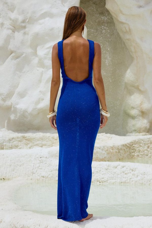 Make a stunning entrance in our Adriana Maxi Dress, featuring a captivating jewel-toned blue hue with delicate micro sequins and a dramatic plunging open back that’s perfect for upscale evenings and special occasions.