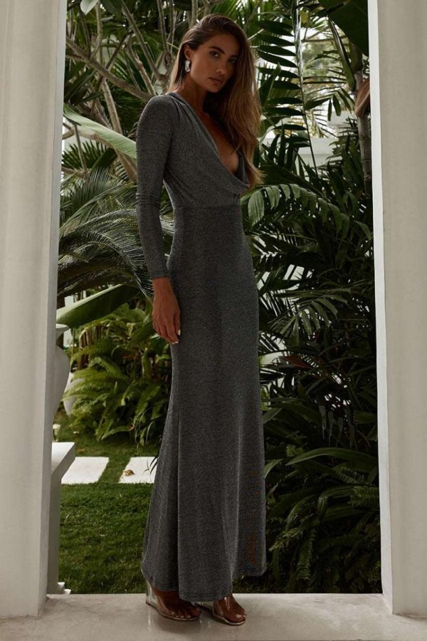 Elevate your evening look with our stunning Amara maxi dress, featuring a dramatic plunging cowl neckline that beautifully accentuates your silhouette. This elegant gown hugs your curves with sophisticated full-length sleeves and a graceful maxi length that creates a truly captivating presence.