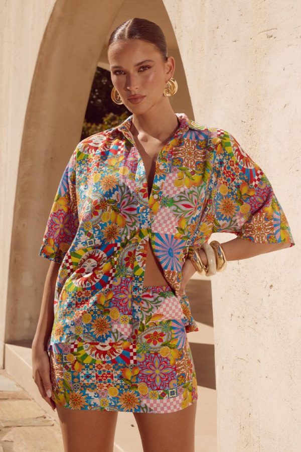 Meet your new warm-weather essential: our Anacapri Shirt features a vibrant floral print and effortless relaxed fit perfect for sunny days. Style this statement piece with our matching Anacapri Mini Skirt and Kali Crop for a complete curated look.