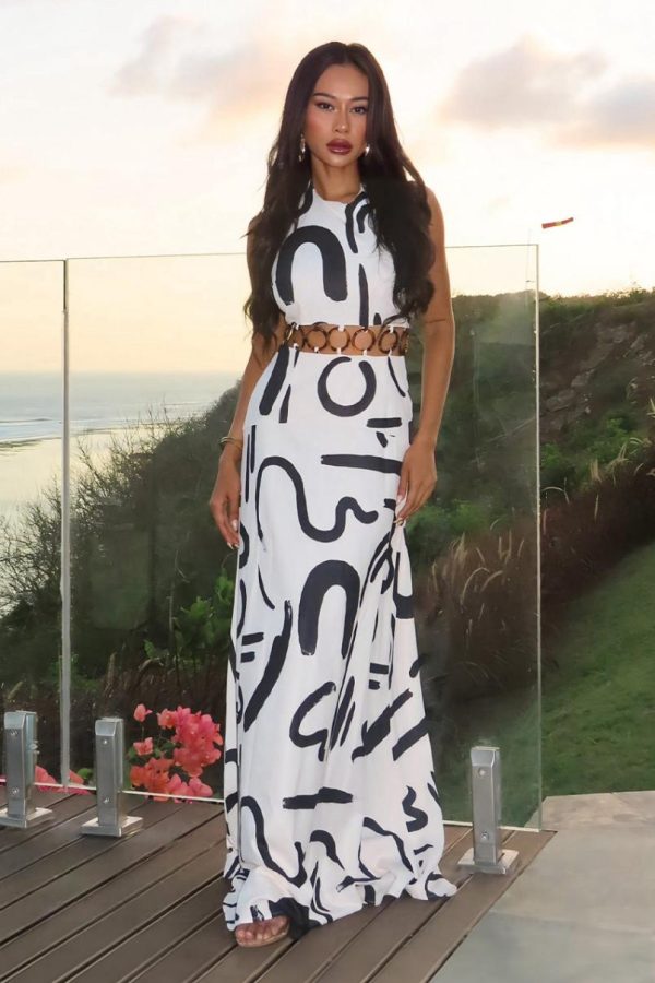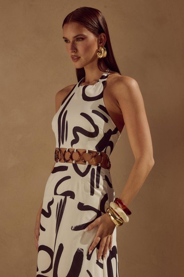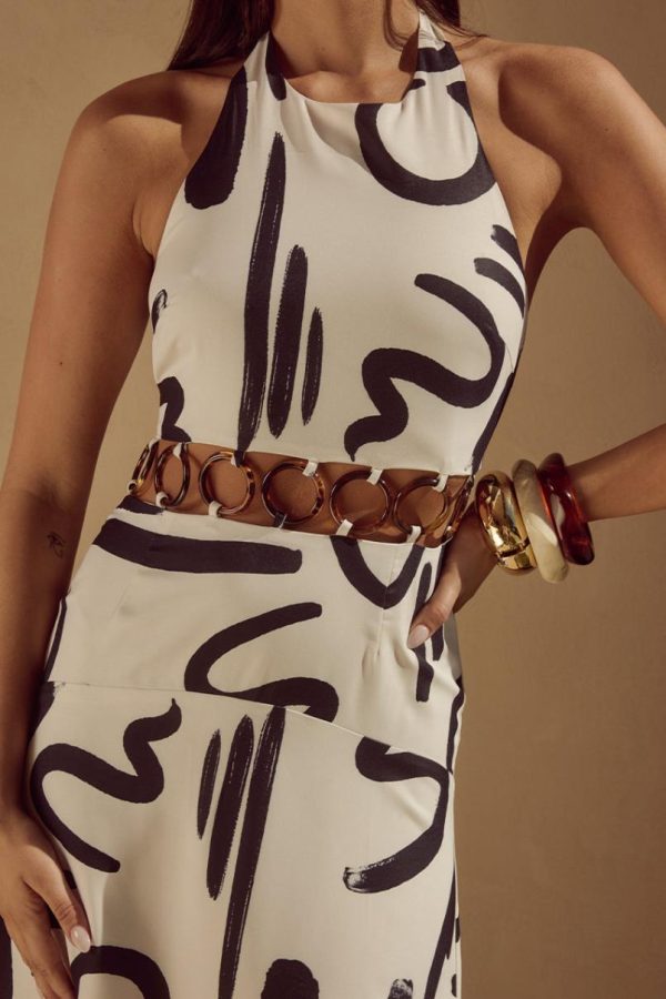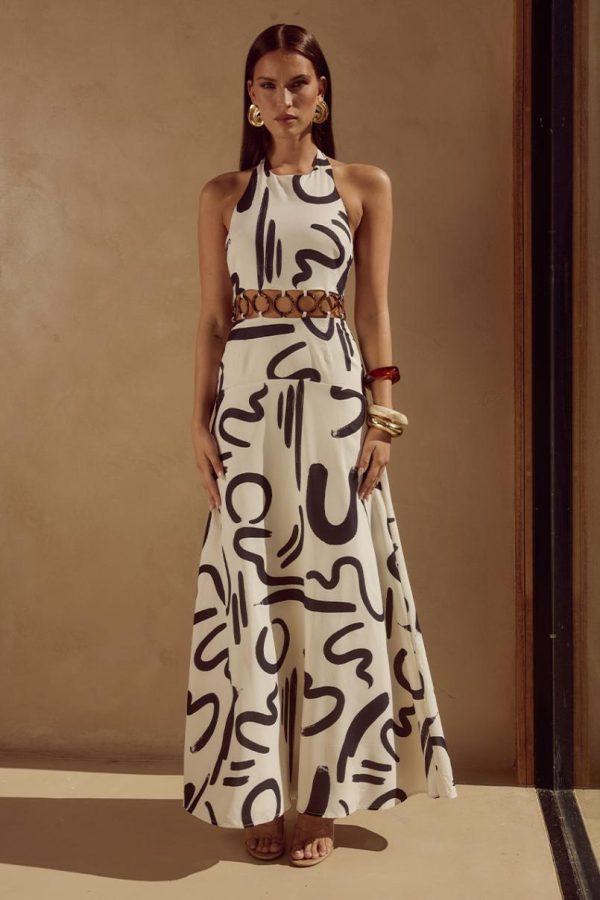 The perfect daytime dress, our Carmen Maxi Dress features a halter neck tie and resin ring detail around the waist.