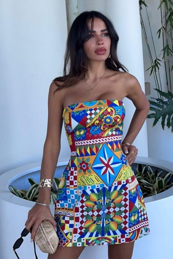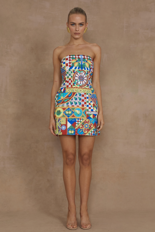 Our Clementine Mini Dress is your staple strapless mini with a vibrant la dolce vita inspired print for a fun refresh.