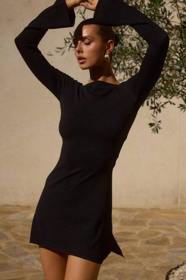 Crafted from a luxe knit fabric, our Coda Mini Dress features a boat neckline and subtle bell sleeves for an effortless everyday look.
