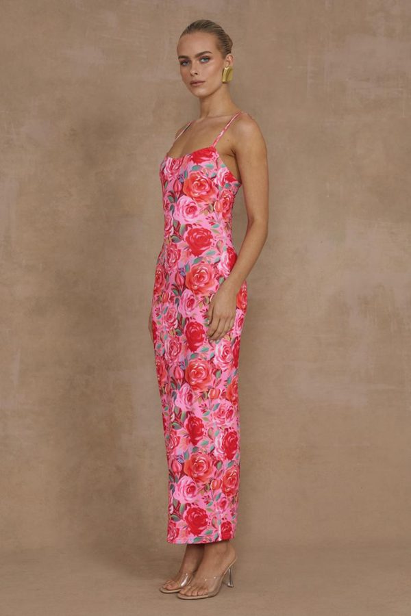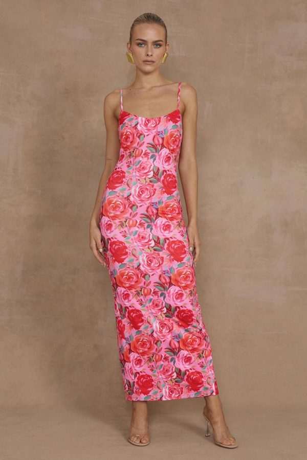 Our Deia Midi Dress features a premium second-skin fabric that feels incredibly luxurious, with a vibrant pink floral pattern that creates a beautifully feminine silhouette perfect for any occasion.
