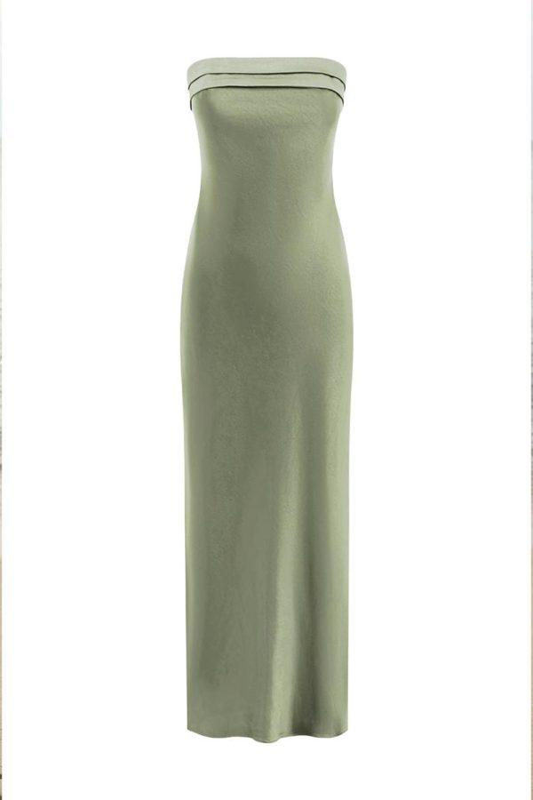Our elegant Delilah Maxi Dress showcases a beautifully folded strapless neckline that creates a sophisticated, modern silhouette perfect for special occasions.