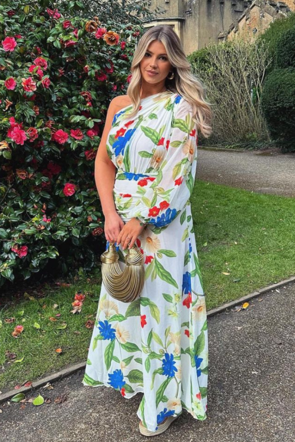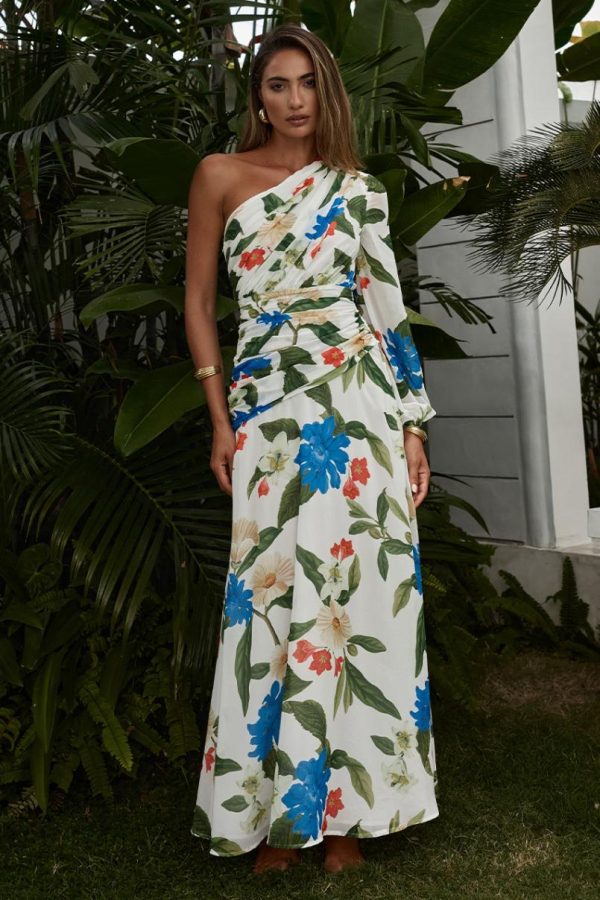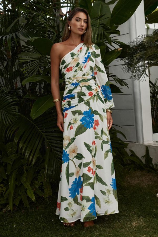 Elevate your event wardrobe with our stunning Floria Maxi Dress, featuring a fashion-forward one shoulder neckline and elegant ruching detail that accentuates your waistline, all showcased in a vibrant floral print that makes a statement.