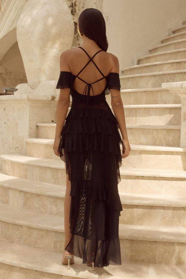 Experience effortless elegance with our Harriette Maxi Dress, crafted from premium mesh fabric that drapes beautifully. The playful frill details and asymmetrical hemline create a captivating silhouette perfect for beach parties and summer gatherings.