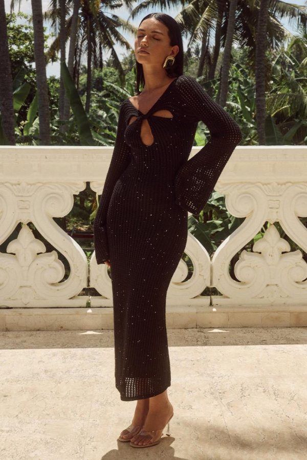 Experience effortless elegance with our Irina Midi Dress, crafted from a premium knit fabric beautifully embellished with micro sequins for the perfect holiday party ensemble that combines comfort and sophistication.