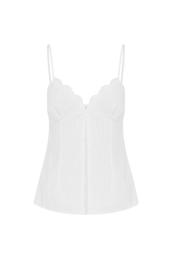 Our Lua Top combines delicate lace trim with a sophisticated pinstripe texture, creating a flowy and feminine piece that’s perfect for summer styling. Complete your outfit by pairing it with our matching Lua Mini Skirt.