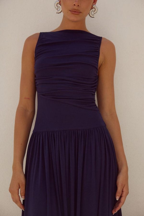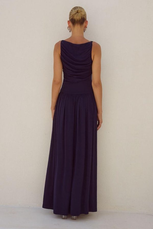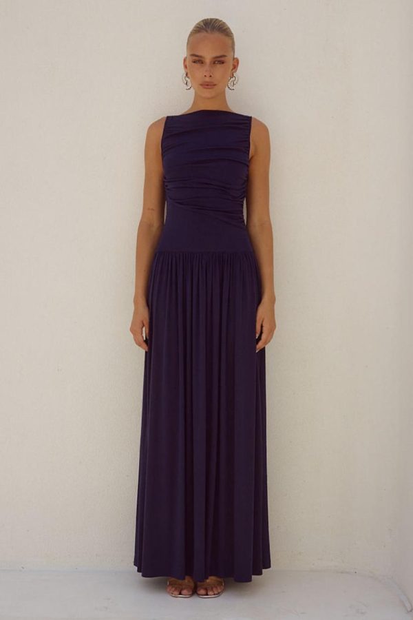 Our Nalla Maxi Dress showcases effortless elegance, with a boat neck and ruching throughout, it’s a versatile and timeless piece.