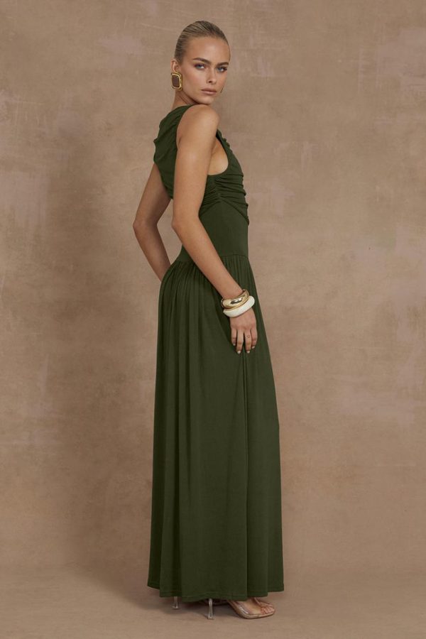 Our Nalla Maxi Dress showcases effortless elegance, with a boat neck and ruching throughout, it’s a versatile and timeless piece.