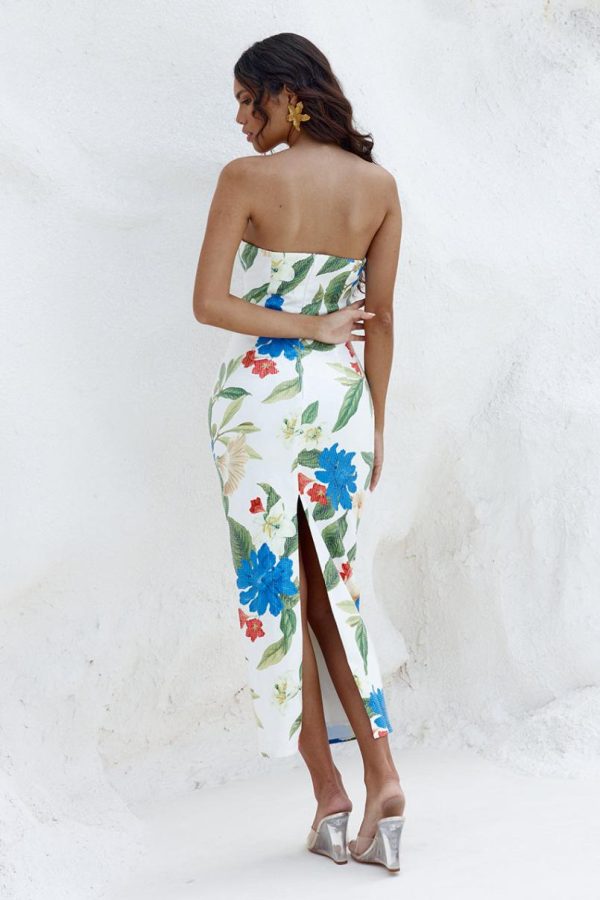 Our Romina Midi Dress hugs the body with a beautiful sequinned fabric that catches the light, featuring a strapless neckline and midi length.