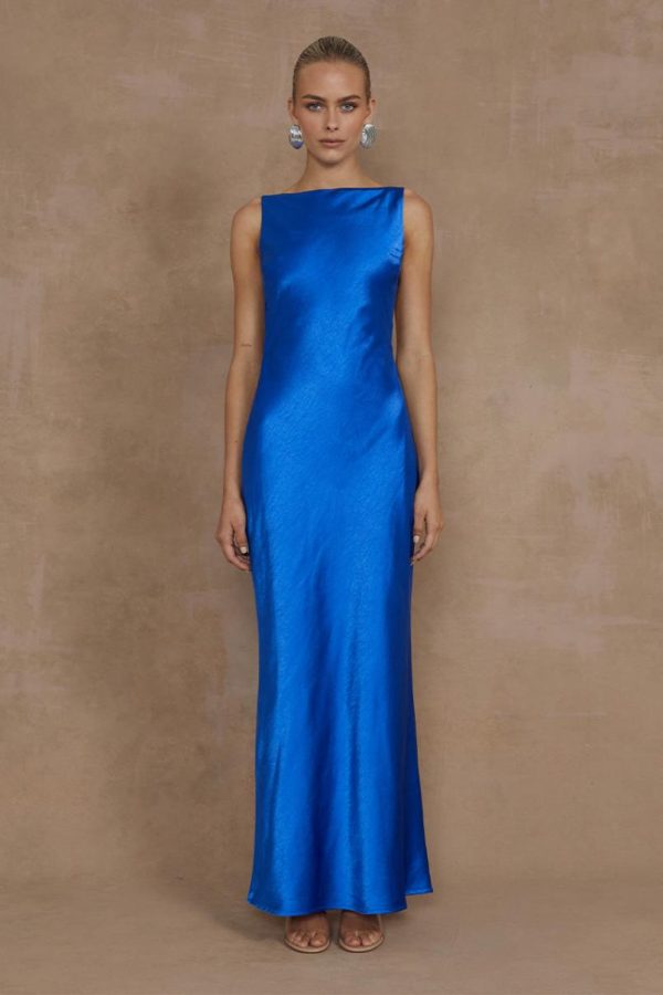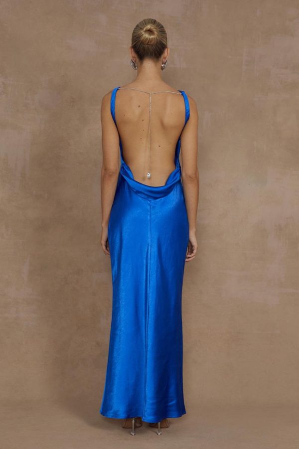 Featuring an elegant boat neckline and an open back with a jewel detail, our Samsara Maxi Dress is perfect for a wedding or formal event.