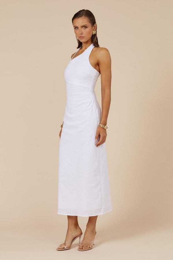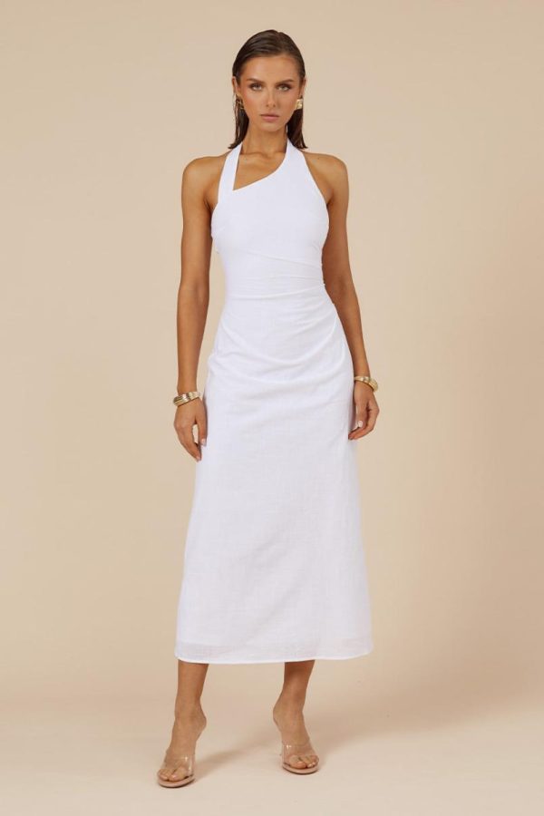 Elevate your getaway wardrobe with the Saphira Long Midi Dress, featuring a stunning asymmetrical neckline and strategic ruching at the waist that creates a beautifully flattering silhouette.