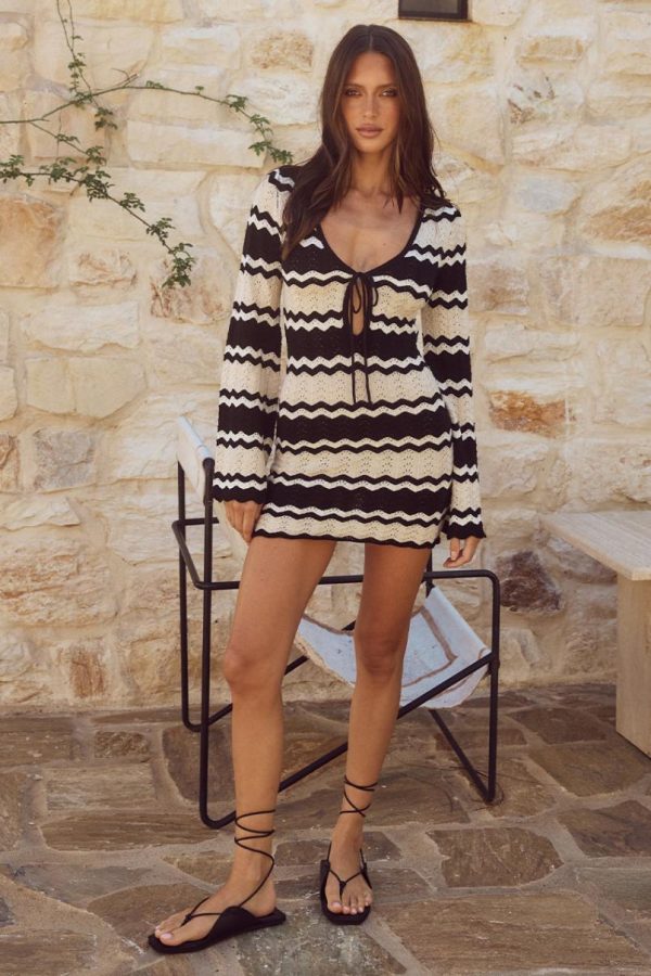 Our Sofia Mini Dress features full length sleeves and a scooped neckline with tie up detail, in easy to wear neutral tones.