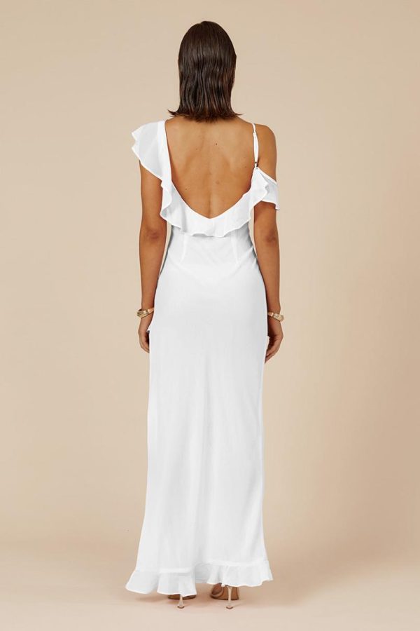 Showcasing a chic asymmetrical neckline and hemline with delicate frill accents, our Vacanza Maxi Dress offers effortless elegance perfect for summer celebrations and warm-weather occasions.