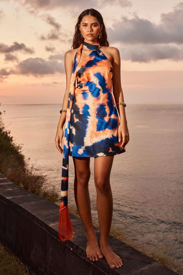 – Statement asymmetrical halter neck with secure button closure and elegant sash detailing