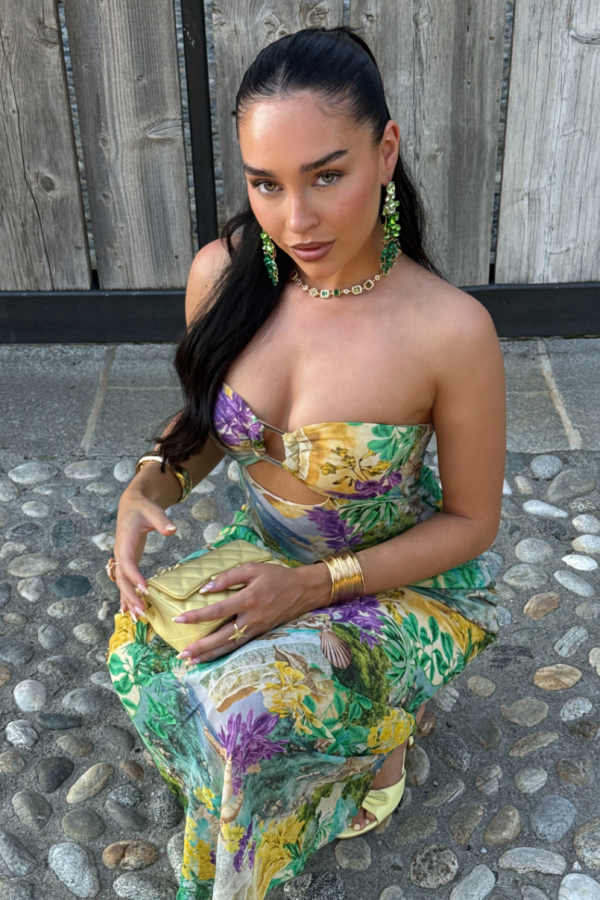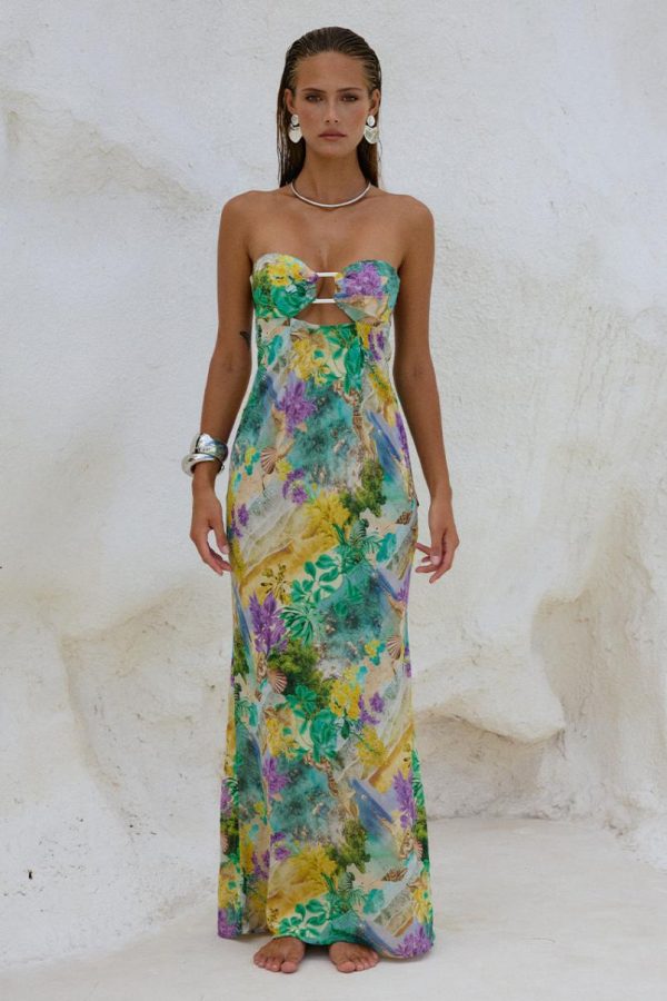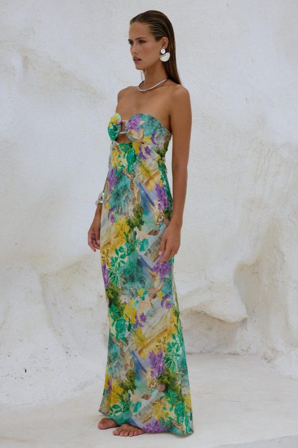 Our stunning Velzy Strapless Dress features a beautifully feminine silhouette that cascades gracefully to the floor, creating an effortlessly elegant look perfect for special occasions.