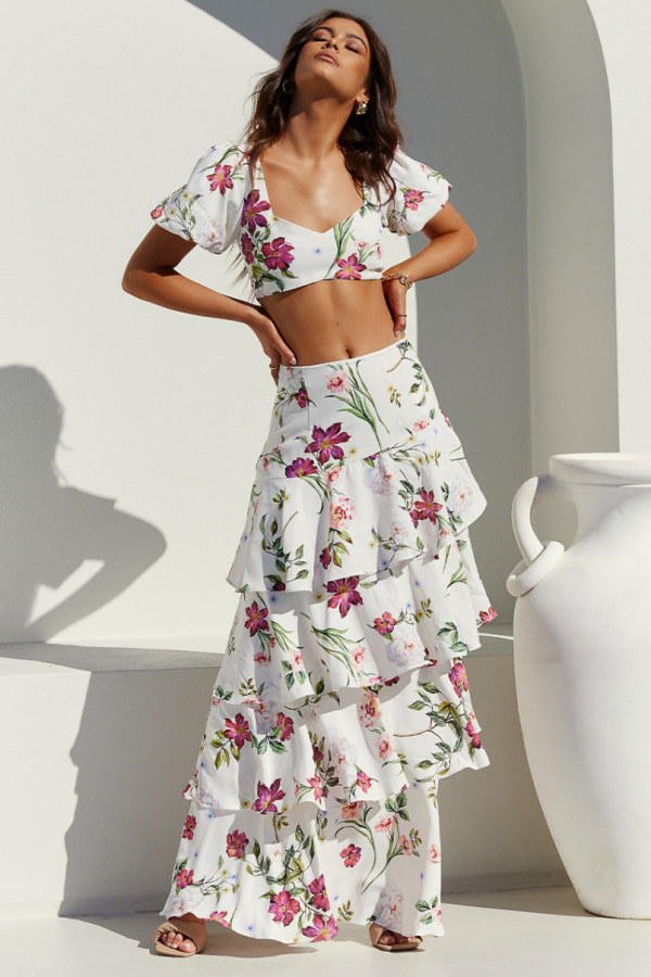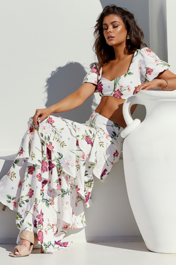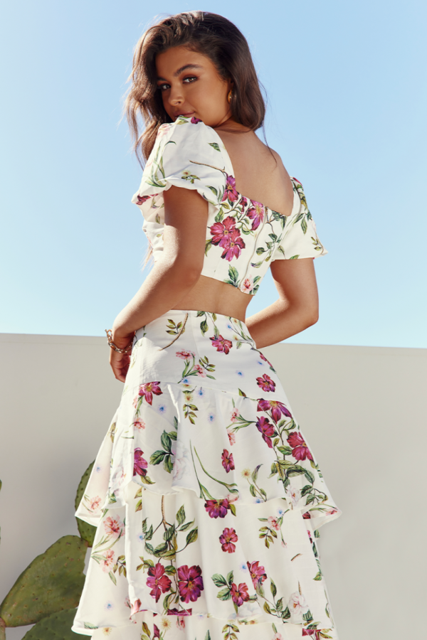Our Yokana Top features a cropped length, sweetheart neckline with puff short sleeves, zipper at the back. This garment has lining and no stretch. 100% Polyester. Please refer to care label for garment care instructions. Colours may appear slightly different to the website due to lighting, computer picture resolution and monitor settings. Print placement may vary between each individual item.
